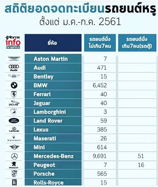สวัสดีครับเพื่อน ๆ วันนี้ทางแอดมินจะขอนำข้อมูลดี เกี่ยวกับการ จดทะเบียนรถยนต์หรู ในประเทศไทย ในช่วง 7 เดือนที่ผ่านมา (ม.ค – ก.ค 2561) มาให้เป็นเพื่อน ๆ ได้ทราบกัน แน่นอนว่าหนึ่งในสิ่งที่เพื่อน ๆ ต้องการที่จะทราบ คือยอดจดทะเบียนรถยี่ห้อในฝันไม่ว่าจะเป็น Ferrari / Lamborghini / Porsche หรือเเม้กระทั่ง Aston Martin ในช่วงเวลาที่ผ่านมามียอดจดทะเบียนกี่คันกันบ้าง